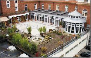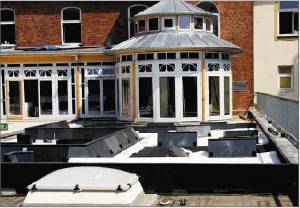 Hinzu kam, dass das Regenwasser von den umgebenden Dachflächen auf das zu begrünende Dach geführt wurde. Es existierten nur fünf Abläufe für das Regenwasser. Drei dieser Abläufe wurden von der 200 qm großen Tanzfläche überbaut und waren nur durch ein Drainrohr zugänglich. Effektiv standen so nur zwei Dachgullys zur Verfügung. Trotz begrenzter Tragfähigkeit des Daches sollte die Tanzfläche kompromisslos aus italienischem Feinsteinzeug angefertigt werden. So blieb wenig Gewichtspielraum für andere Materialen. Außerdem musste den hohen ästhetischen Anforderungen des Bauherrn entsprochen werden. |